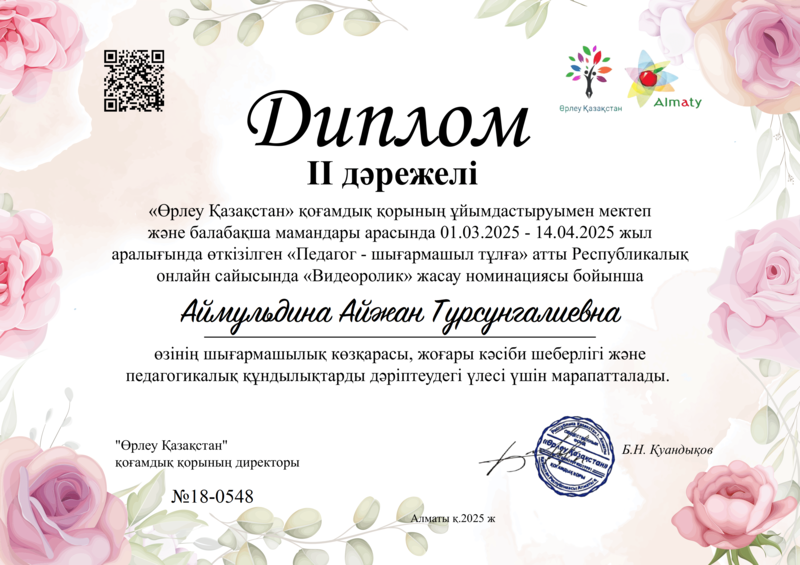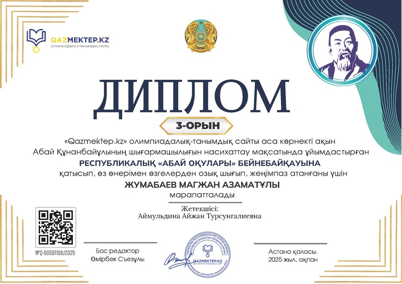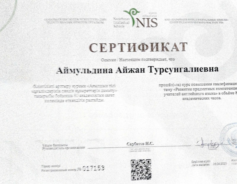 Hello Everybody I am Aizhan Tursungalievna Aimuldina i am a teacher of English language! I had finished Pavlodar State Pedagogical University in 2009. In 2021 i had gotten my master degree. In 2019 i had gotten status of pedagog-expert. And i am preparing on my next stage now.