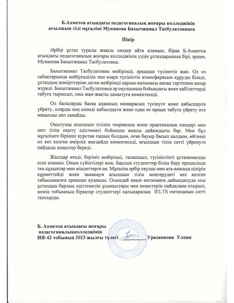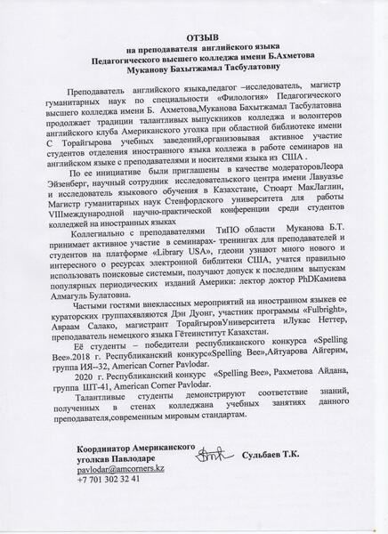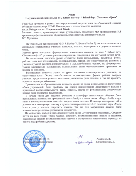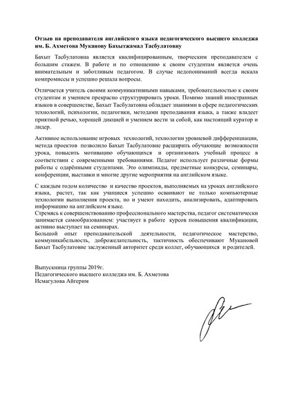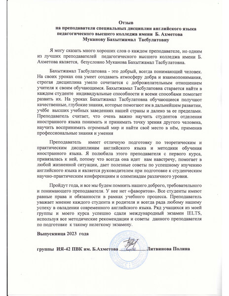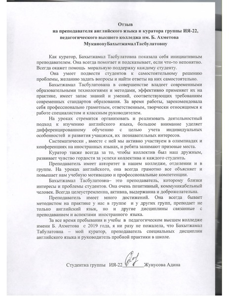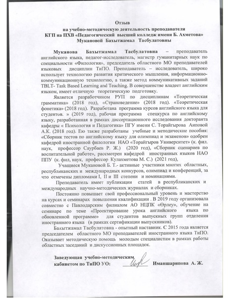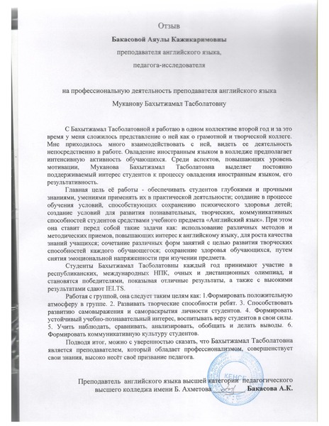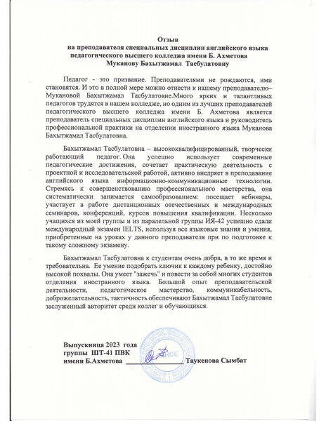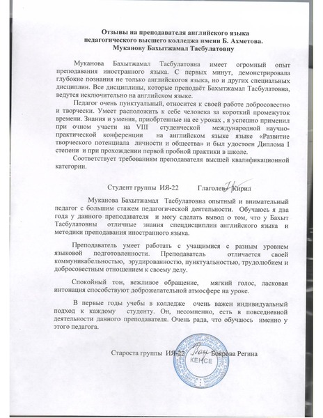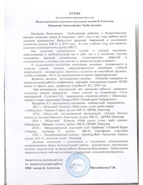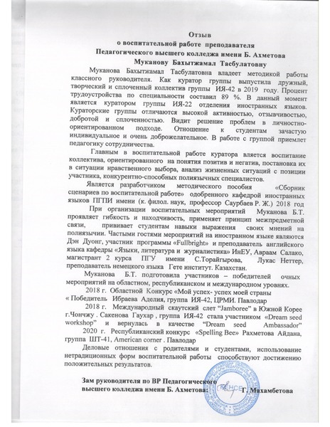 «Сборник сценариев по воспитательной работе» рассмотрен и одобрен кафедрой иностранной филологии НАО «Торайгыров Университет» (к. пед. наук, доцент ВАК, заведующая кафедрой иностранной филологии Каирбаева А.К.) и зам руководителем колледжа Махамбюовой Г.И.
