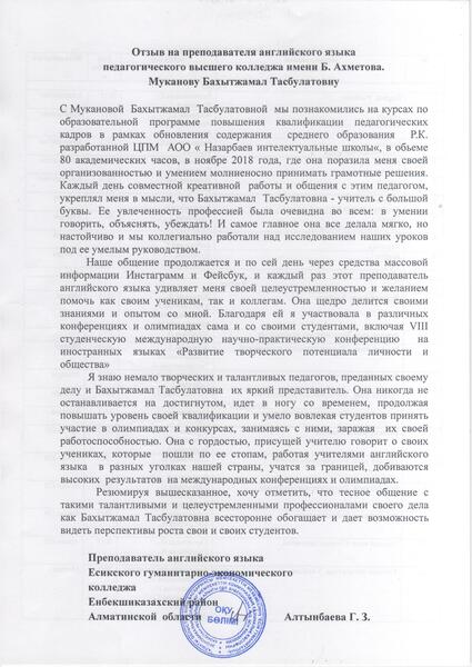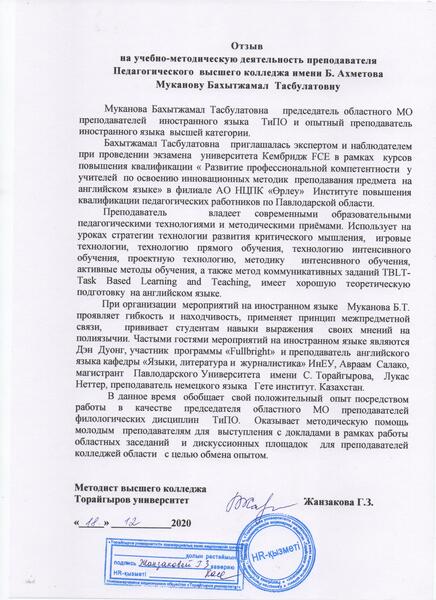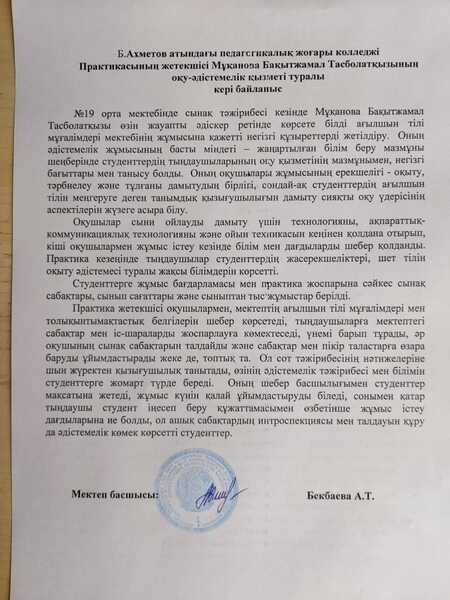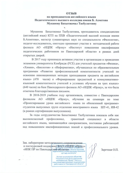 В 2019 году организовала совместно с Павлодарским филиалом АО НЦПК «Өрлеу», oбучение на семинаре по теме «Проектирование урока английского языка по обновленной программе» для cтудентов выпускных групп отделения иностранного языка и курсы английского языка для студентов первого курса колледжа
