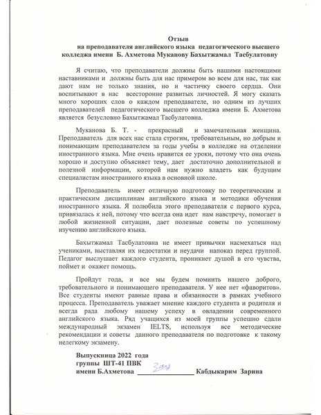 Систематическая и целенаправленная деятельность, как предметника, так и классного руководителя дает положительные результаты при выпуске групп отделения иностранного языка. Об этом свидетельствуют итоги государственных экзаменов, положительная динамика сдачи международного экзамена IELTS, высокий процент трудоустройства выпускников в учебных заведениях не только РК, но и далеко за ее пределами.